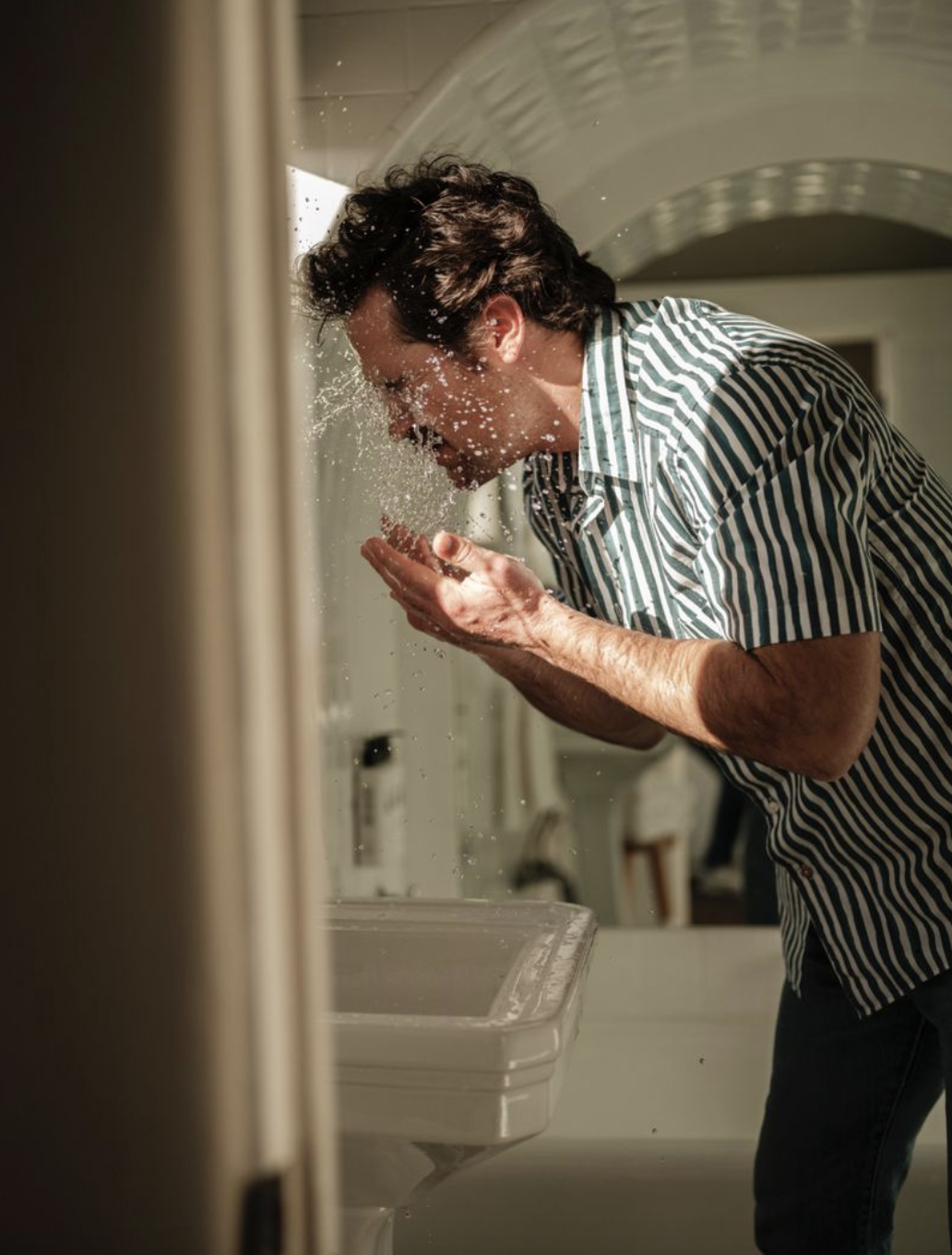 A man in a striped shirt leaning over a bathroom sink, cupping water in his hands, with water splashing on his face.