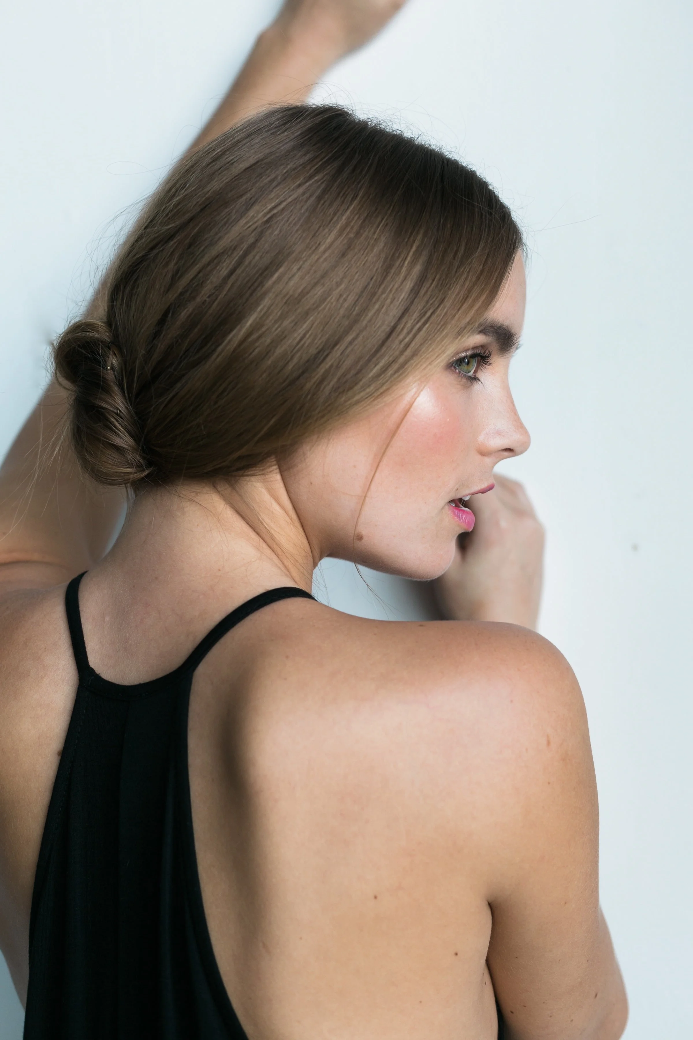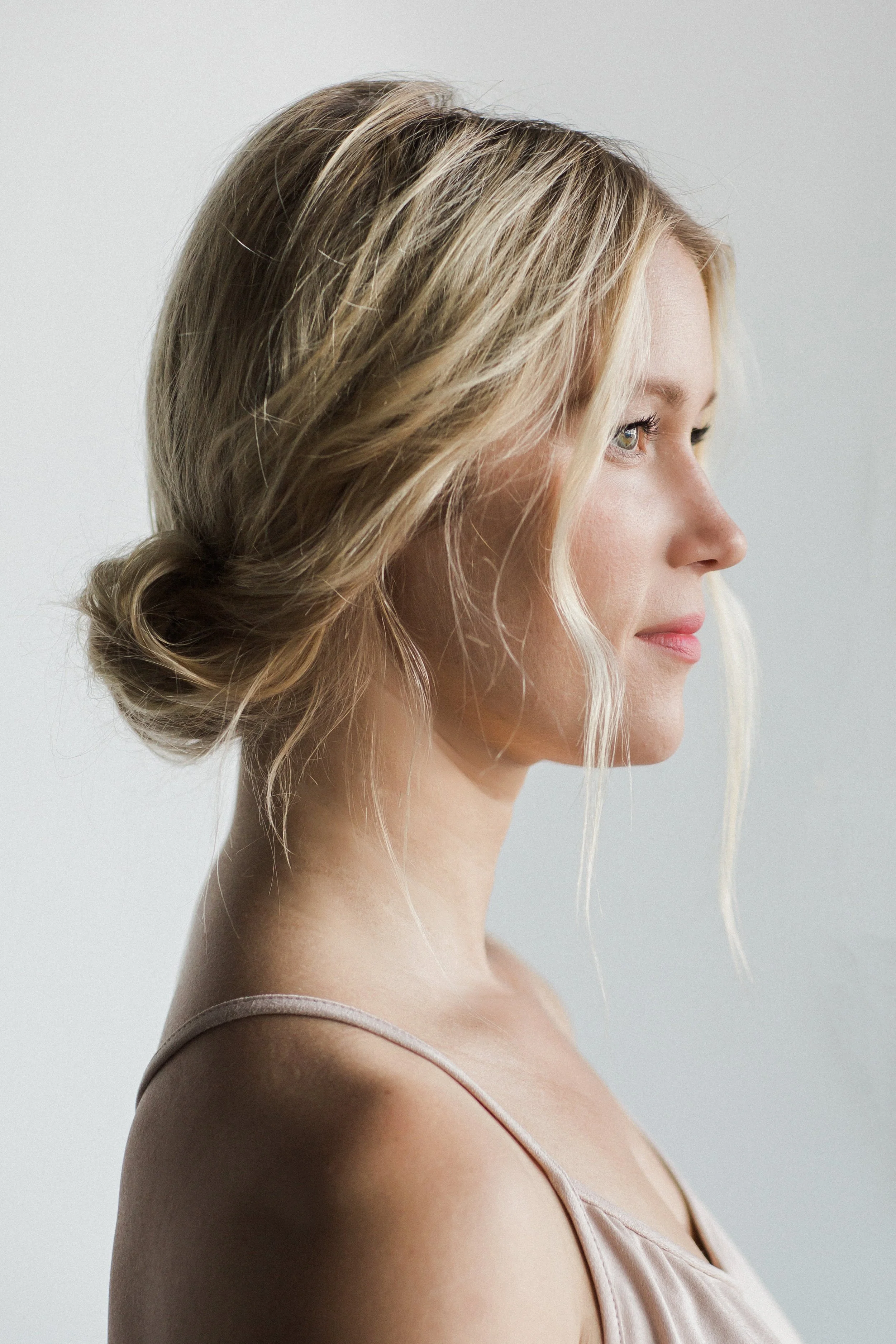Profile view of a woman with blonde hair styled in a loose bun, wearing a light-colored spaghetti strap top, against a plain background.