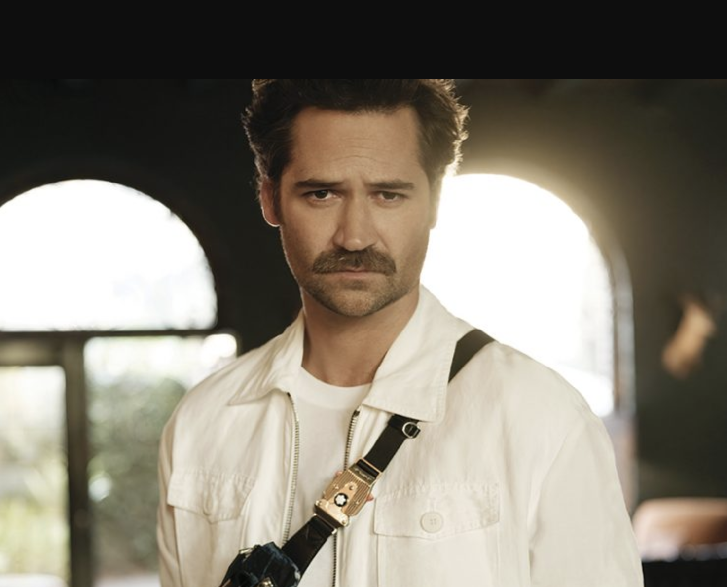 A man with dark hair and a mustache wearing a white jacket and a camera strap around his neck inside a building with large arched windows.