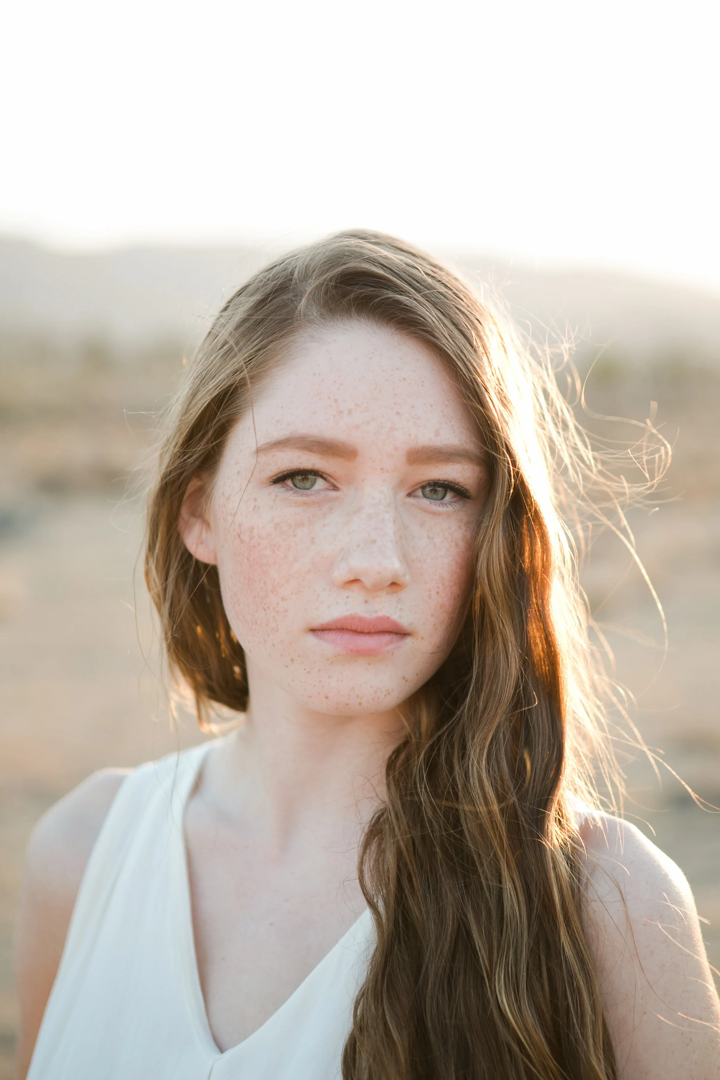Close-up portrait of a woman with blonde wavy hair, minimal makeup, wearing a beige spaghetti strap top, against a neutral background.