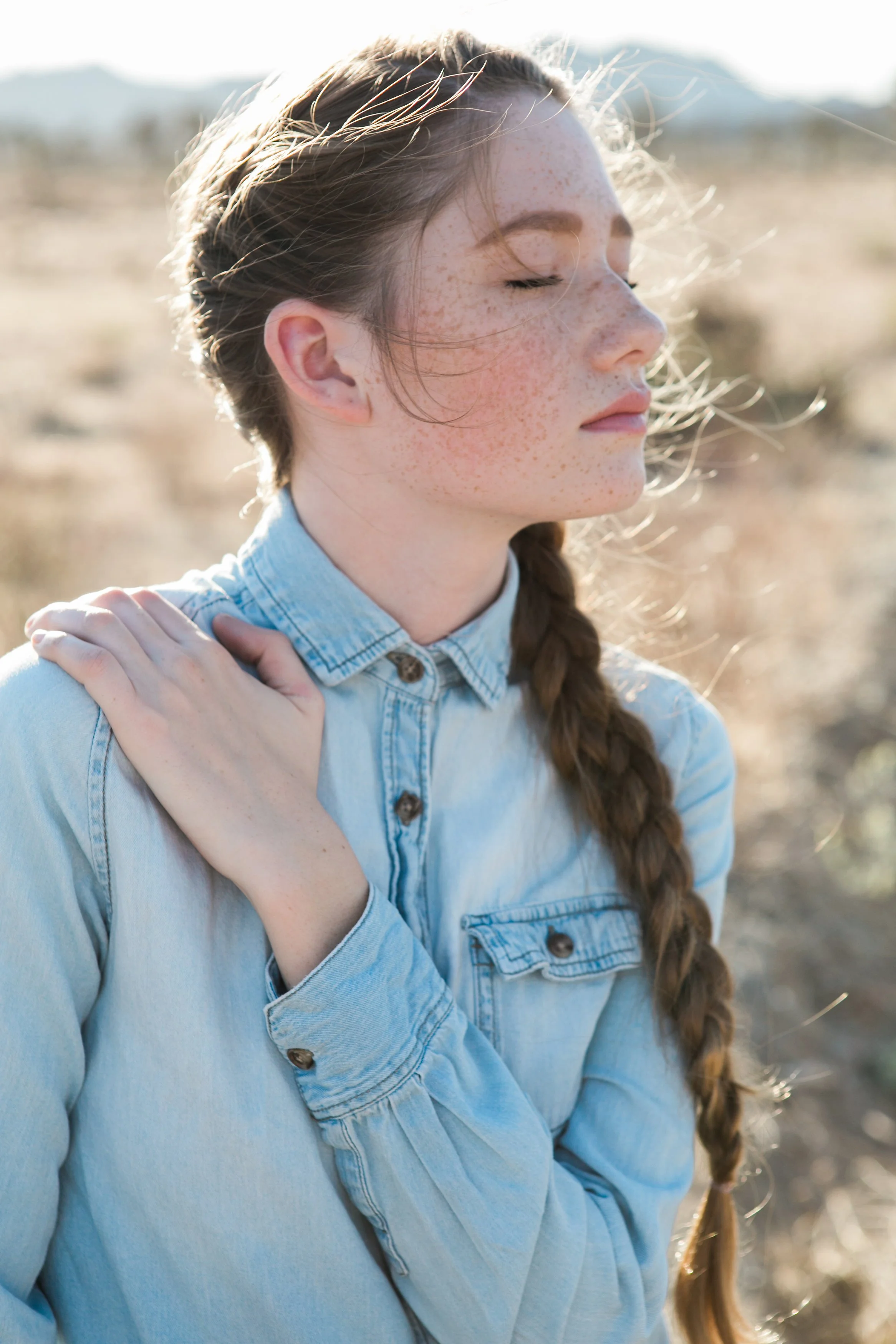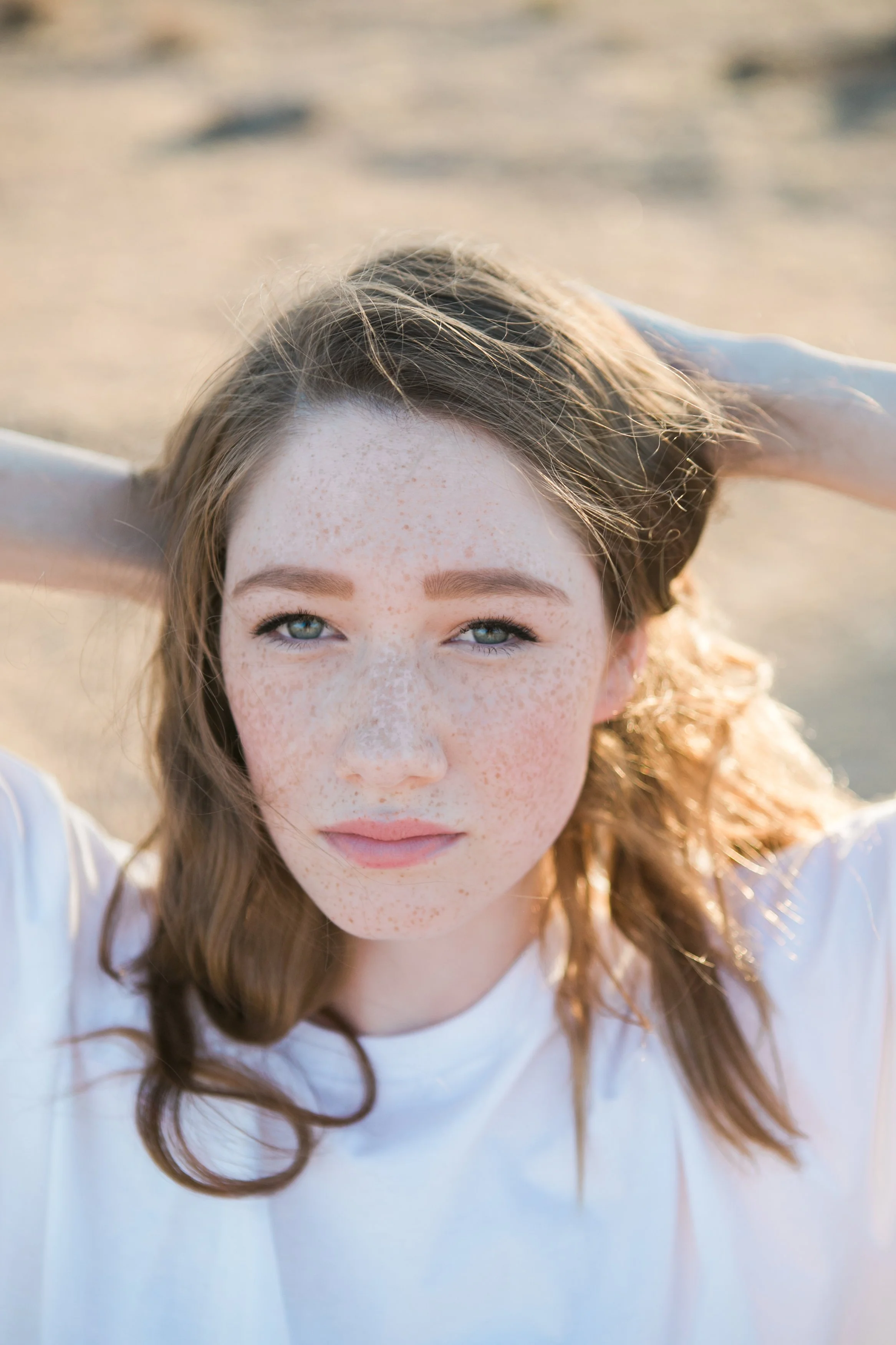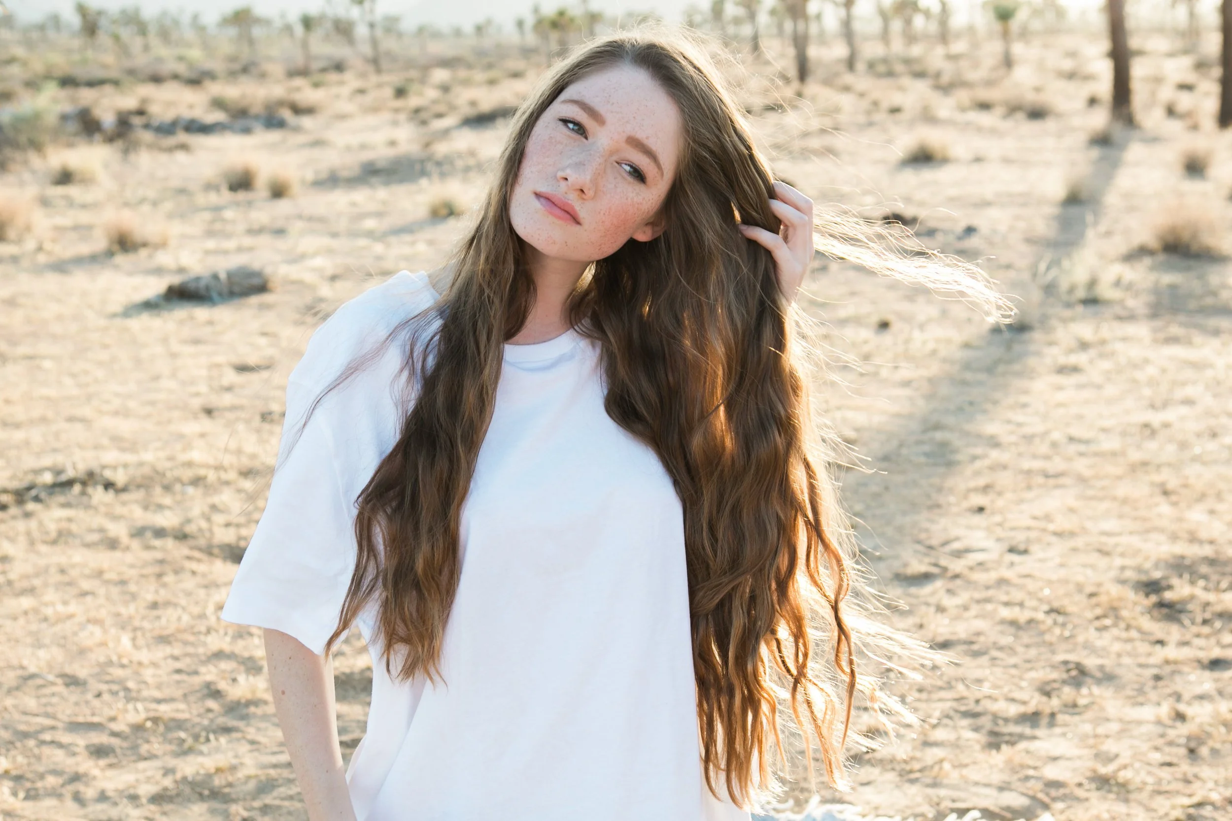 Close-up of a woman with wavy brown hair, green eyes, and light makeup, looking at the camera with her hand touching her hair.