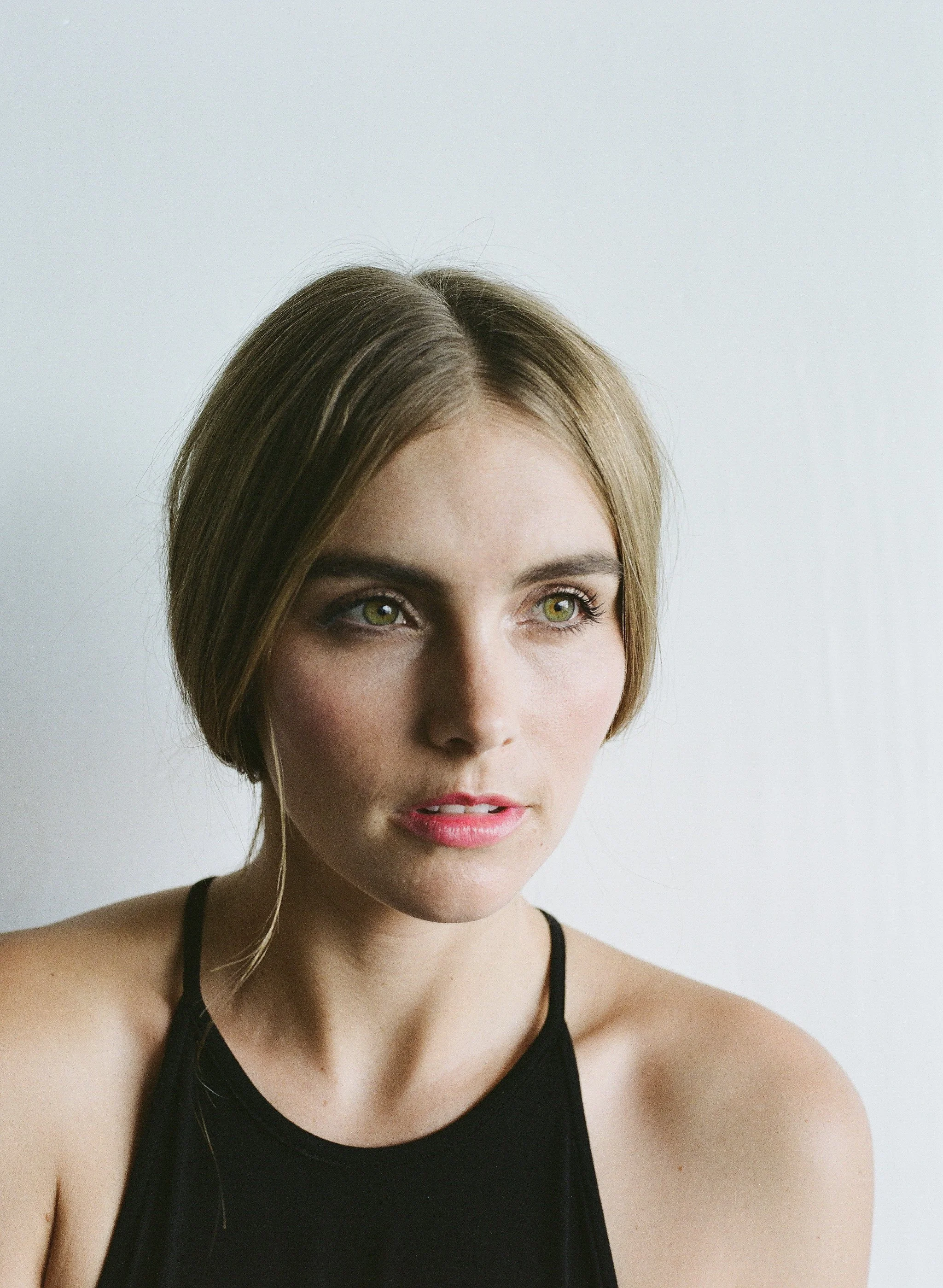 Close-up of a young woman with green eyes, light makeup, and short brown hair, wearing a black tank top, against a plain white background.