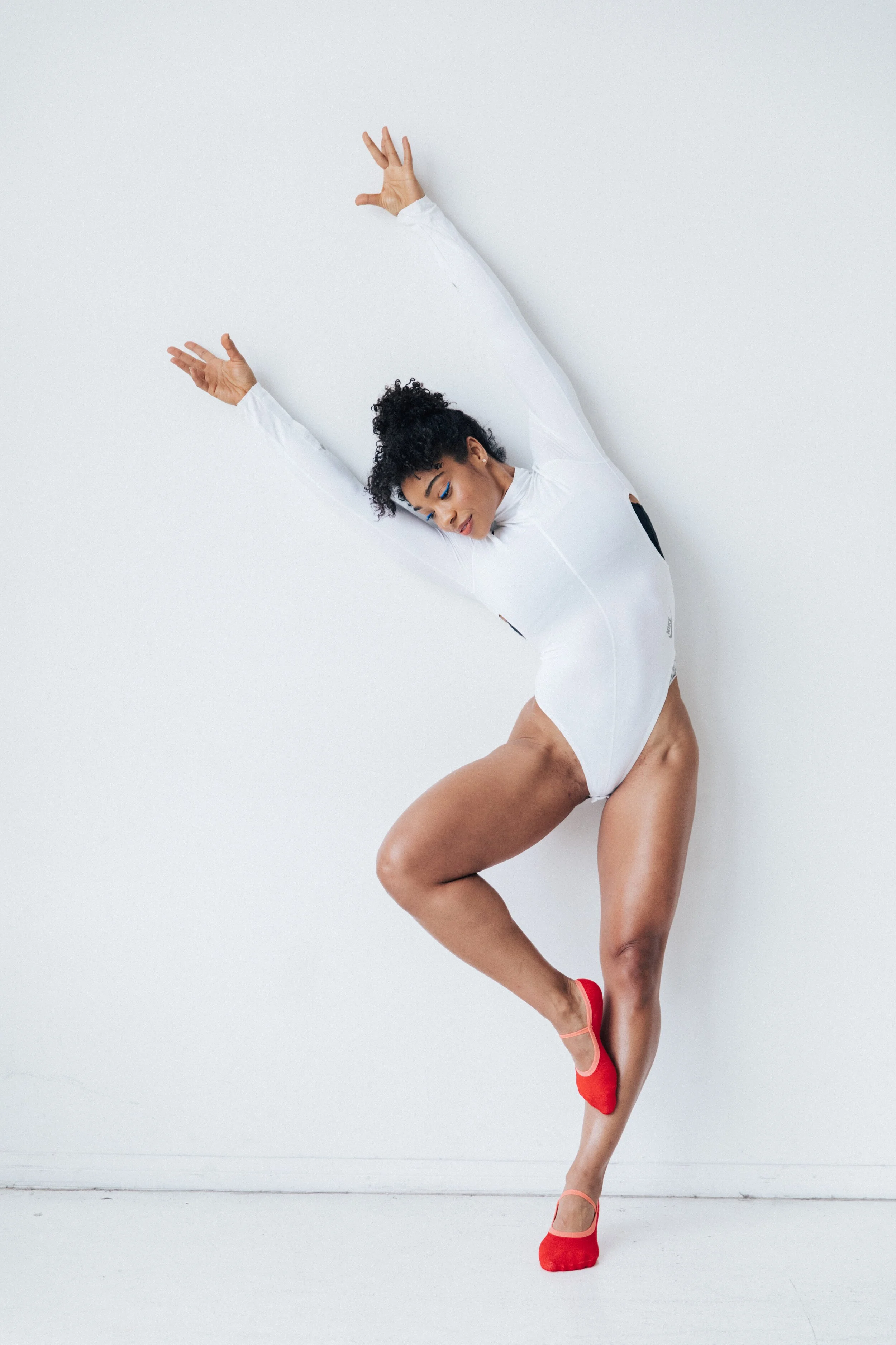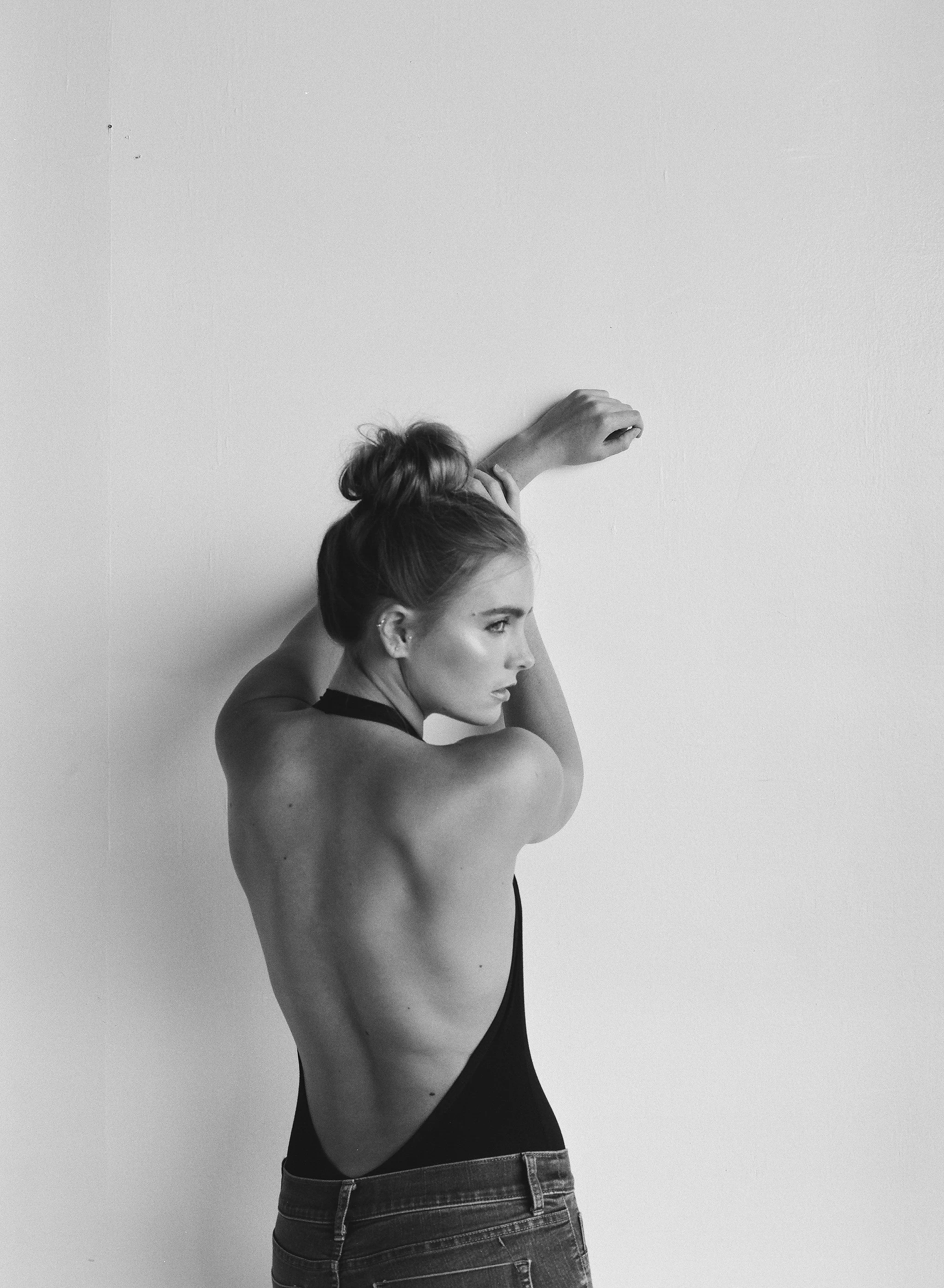 Black and white photo of a woman with her back to the camera, arms raised, head turned to the side, wearing a backless top and jeans, against a plain wall.