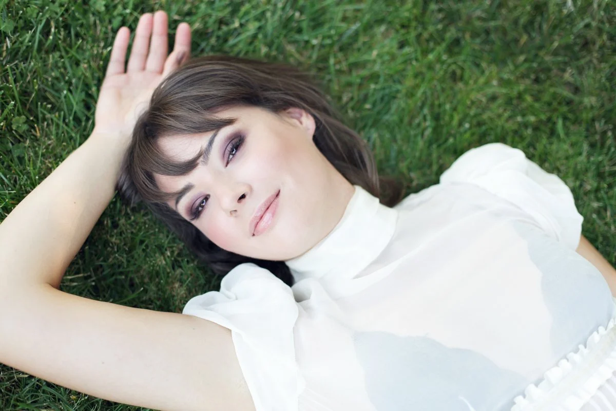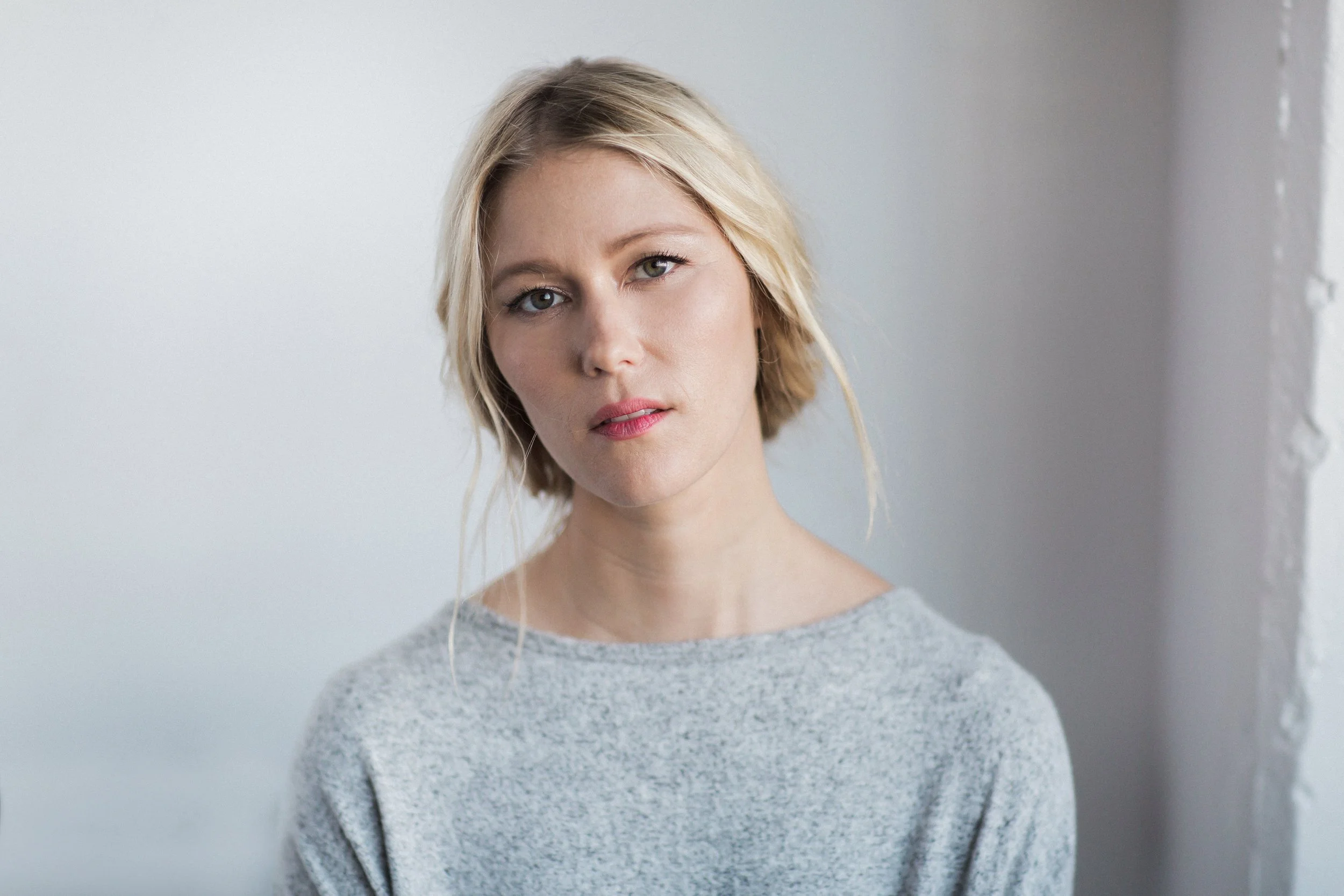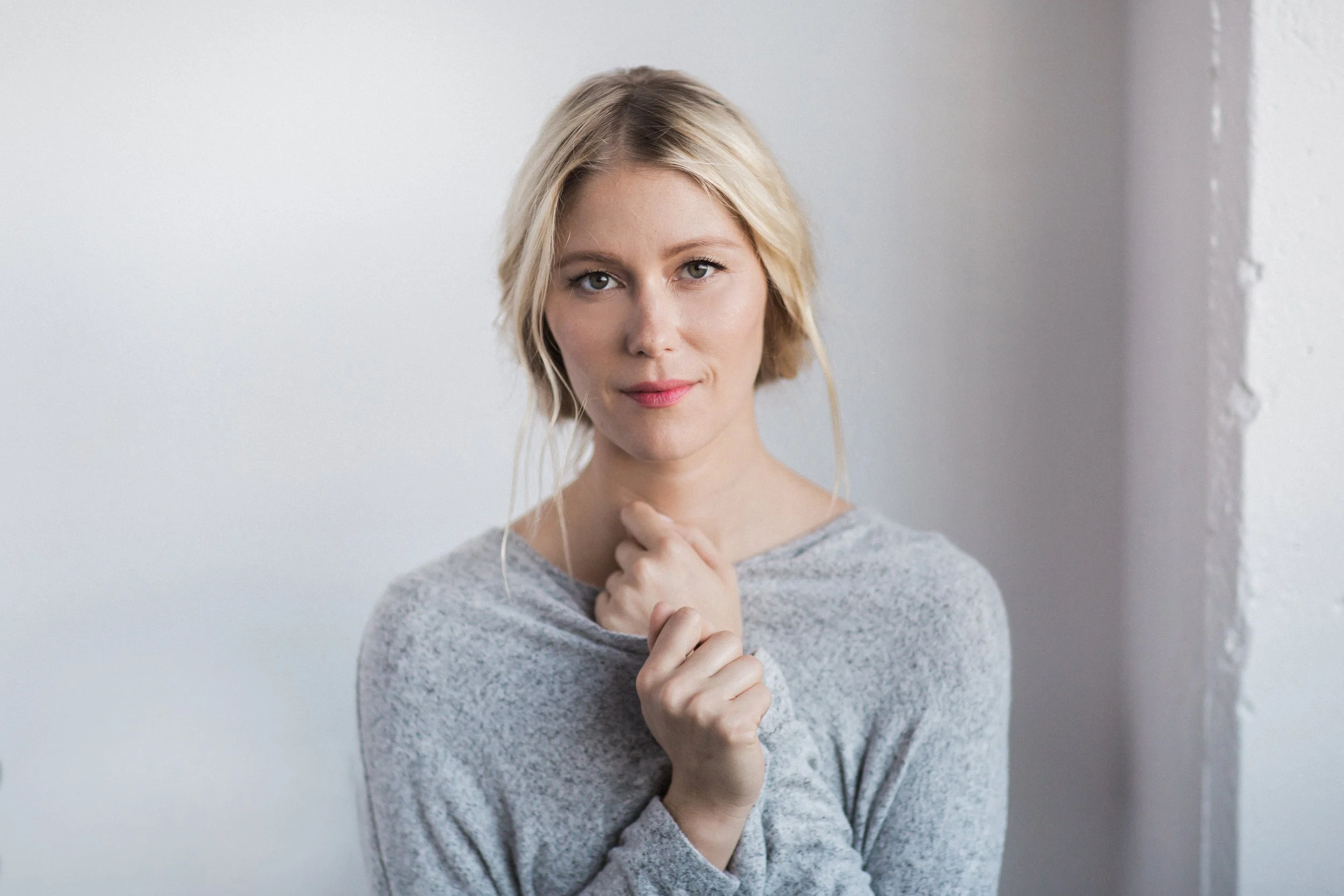 A woman with blonde hair, wearing a light grey sweater, standing against a plain white wall with her hands near her chin, smiling softly at the camera.