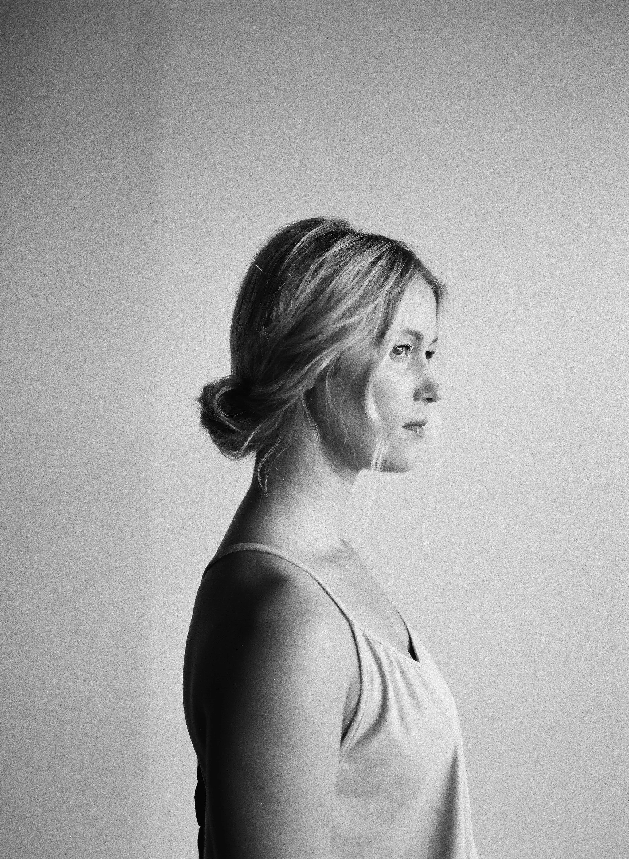 Black and white portrait of a woman in profile with her hair styled in a loose bun, wearing a sleeveless top, against a plain background.