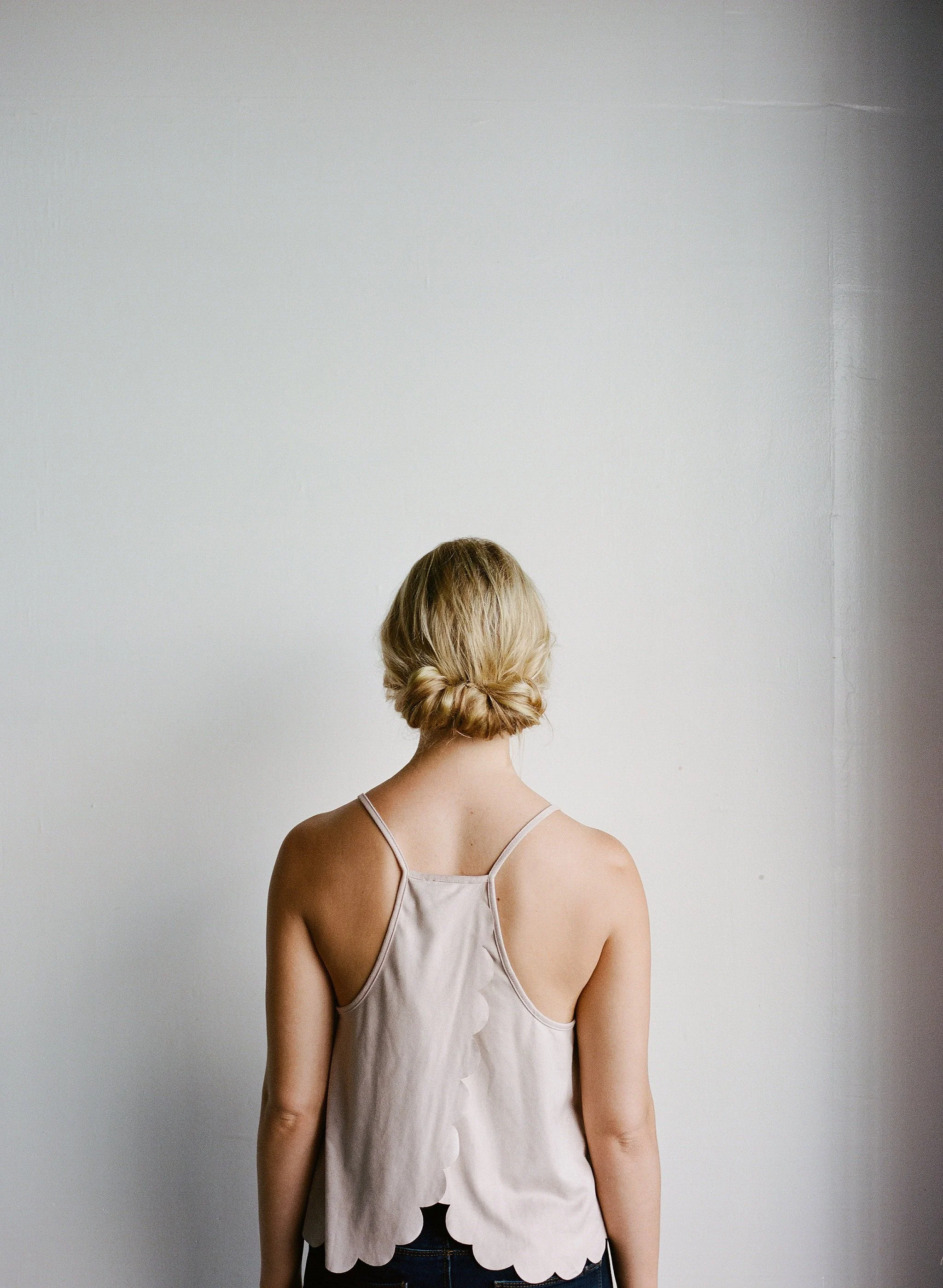 Back view of a woman with blonde hair in a loose bun, wearing a beige camisole top with scalloped edges, standing against a plain white wall.