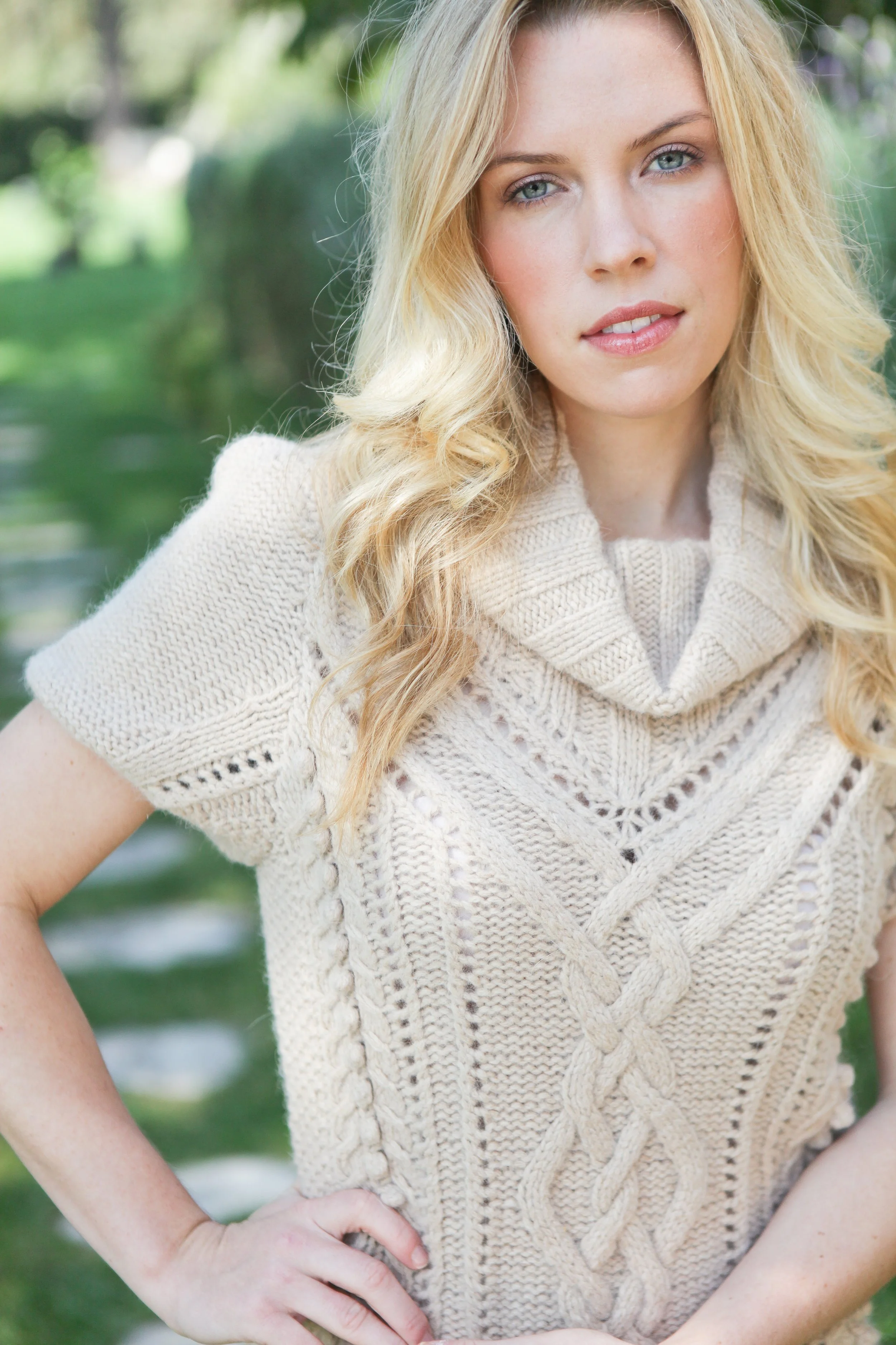 A woman with blonde hair styled in loose waves, wearing a sheer, white lace top with a pineapple pattern, standing against a white wall, touching her chin gently and looking off to the side.