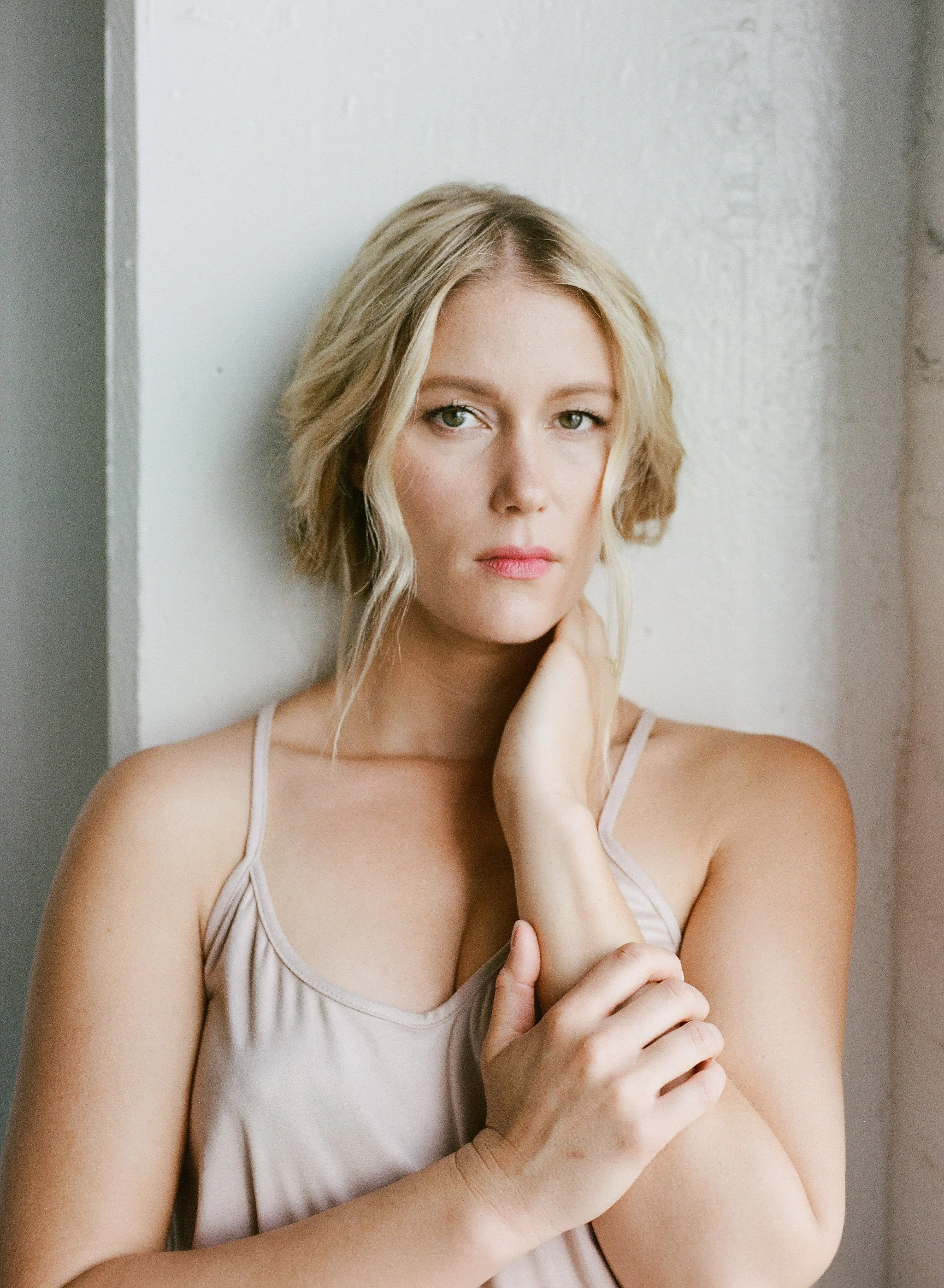 A woman with blonde curly hair and fair skin, wearing a beige camisole top, touching her face gently, looking at the camera with a neutral expression.
