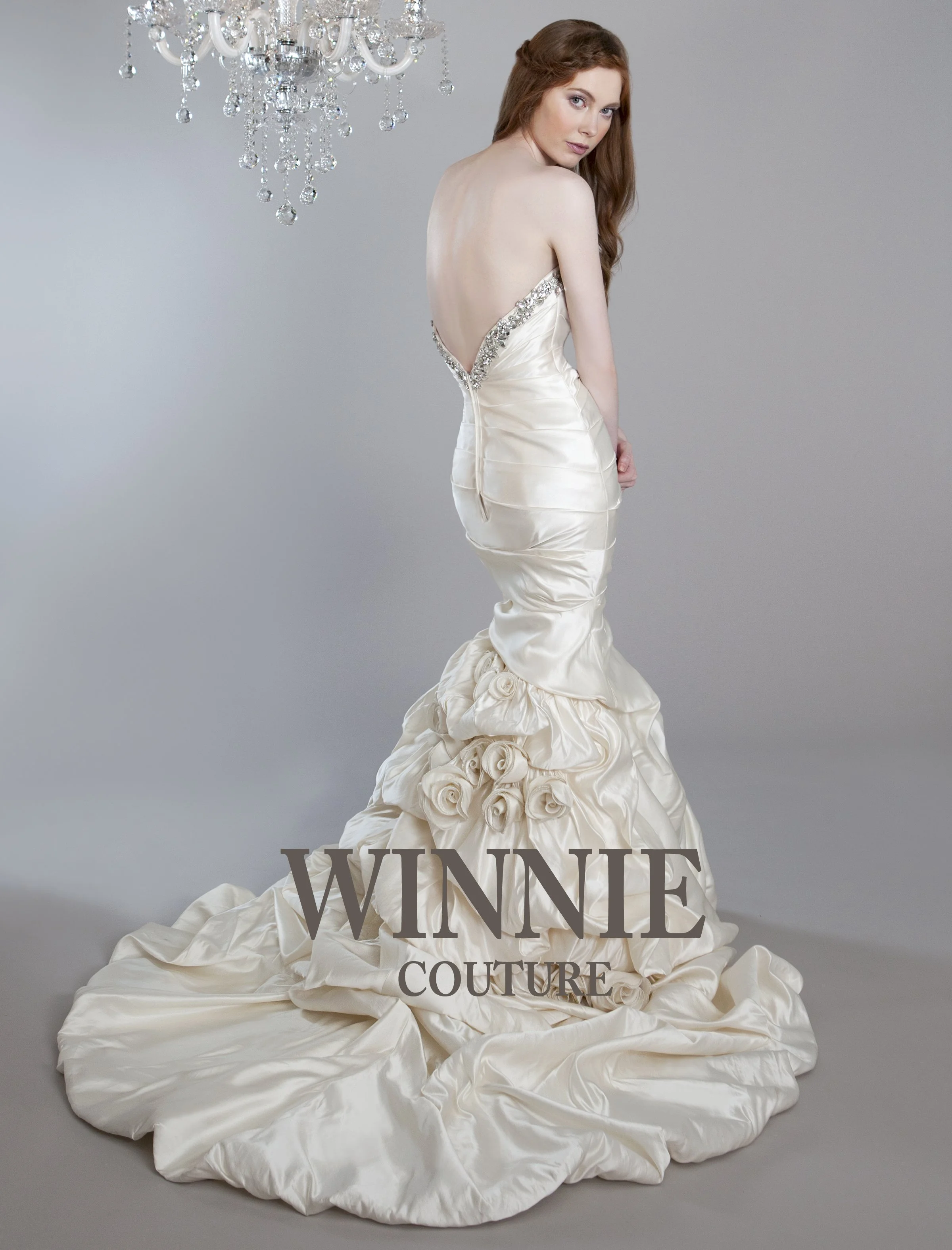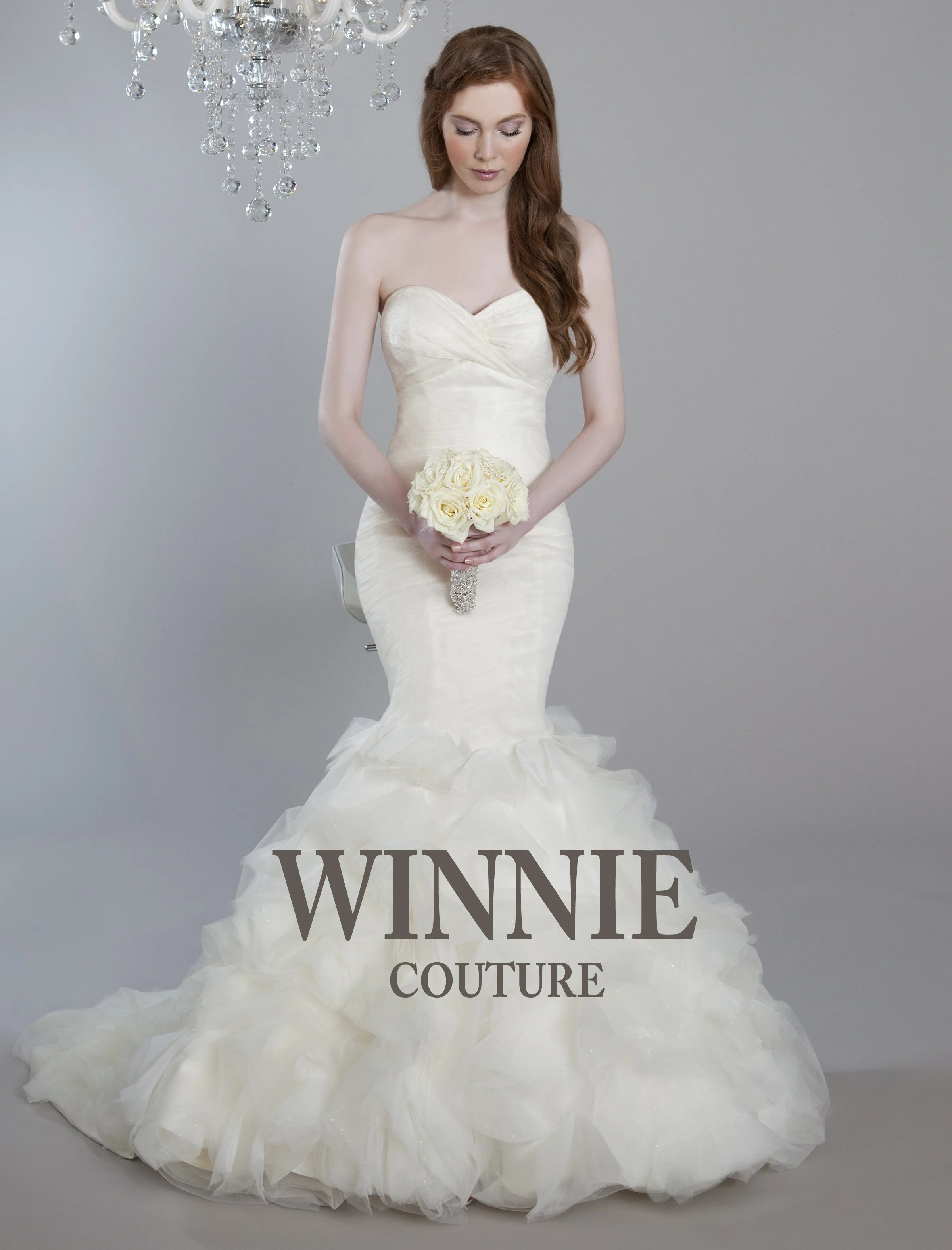 A woman in a strapless wedding gown with a ruffled skirt adorned with roses, standing against a plain background with a chandelier overhead. The text "WINNIE COUTURE" is overlaid on the lower part of the image.