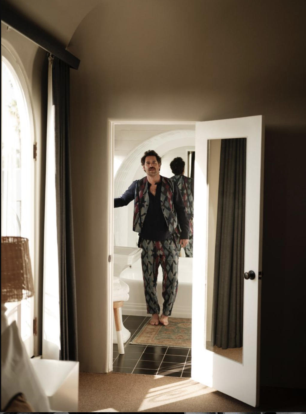 A man in a colorful patterned suit standing barefoot in a doorway, looking into a room, with a mirror reflecting his image.